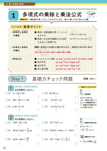 | 授業の復習,定期テスト,入試まで頼れる本格的な問題集-テストによく出る要点のまとめと「基礎力チェック問題」「実力完成問題」の2段階の問題で中1英語が着実に身につく。定期テスト予想問題,別冊解答つき。音声アプリ対応。<新学習指導要領対応> | 授業の復習,定期テスト,入試まで頼れる本格的な問題集-テストによく出る要点のまとめと「基礎力チェック問題」「実力完成問題」の2段階の問題で中1数学が着実に身につく。「定期テスト予想問題」,くわしい別冊解答つき。<新学習指導要領対応> | ||